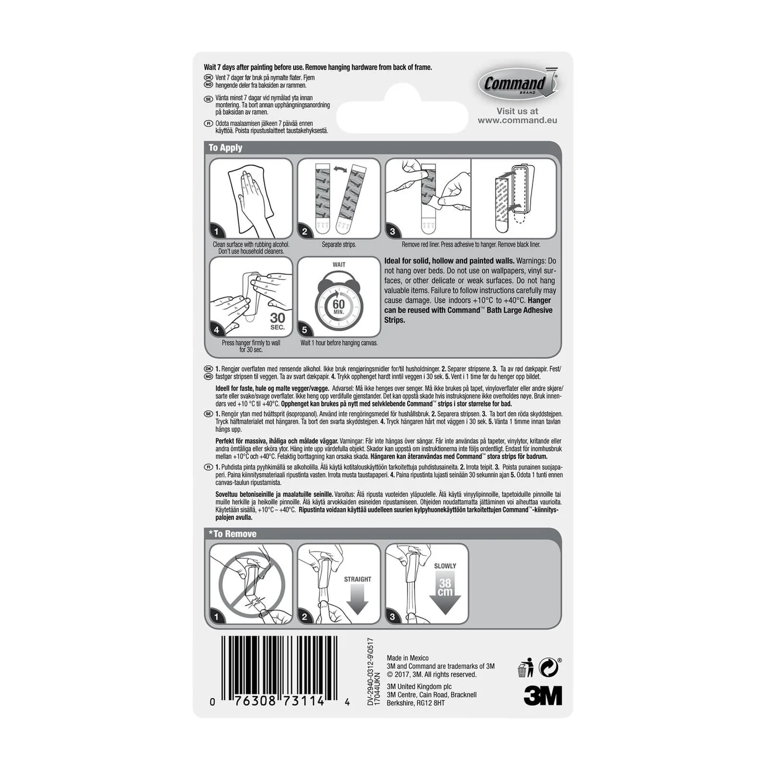 | Fitting Instructions | Wait 7 days after painting before use. After attaching to wall wait 1 hour before hanging anything on the strip/hook. Ideal for solid, hollow and painted walls. Do not use on wallpapers, vinyl surfaces, or other delicate or weak surfaces. |