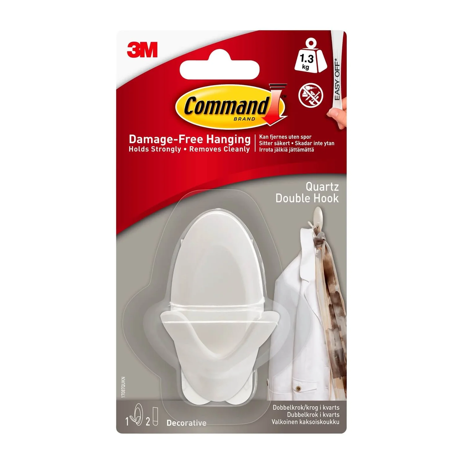 Command Quartz Double Hook is our innovative solution for hanging everyday household items securely and damage free. It holds strongly and removes cleanly using 3M stretch-release technology.