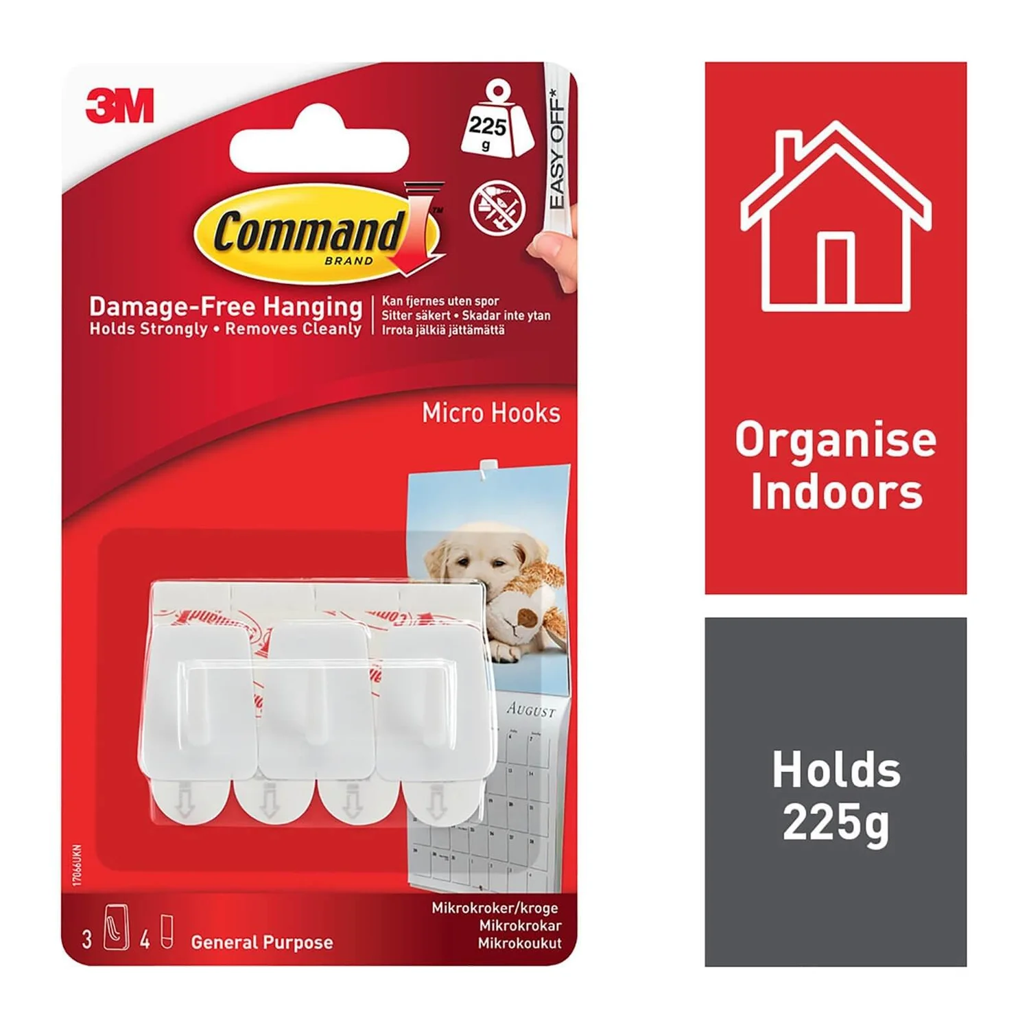 For effective damage free hanging indoors, use Command Micro Hooks. They hold strongly to a variety of surfaces including solid, hollow and painted walls, as well as other materials including wood, tile, metal and glass. They’re easy to apply and remove, leaving no holes, marks or sticky residue. Our hooks blend in seamlessly making them suitable for any room in the house or office. Rehanging them is as easy as applying a Command Refill Strip, so you can take down, move and reuse them again and again.