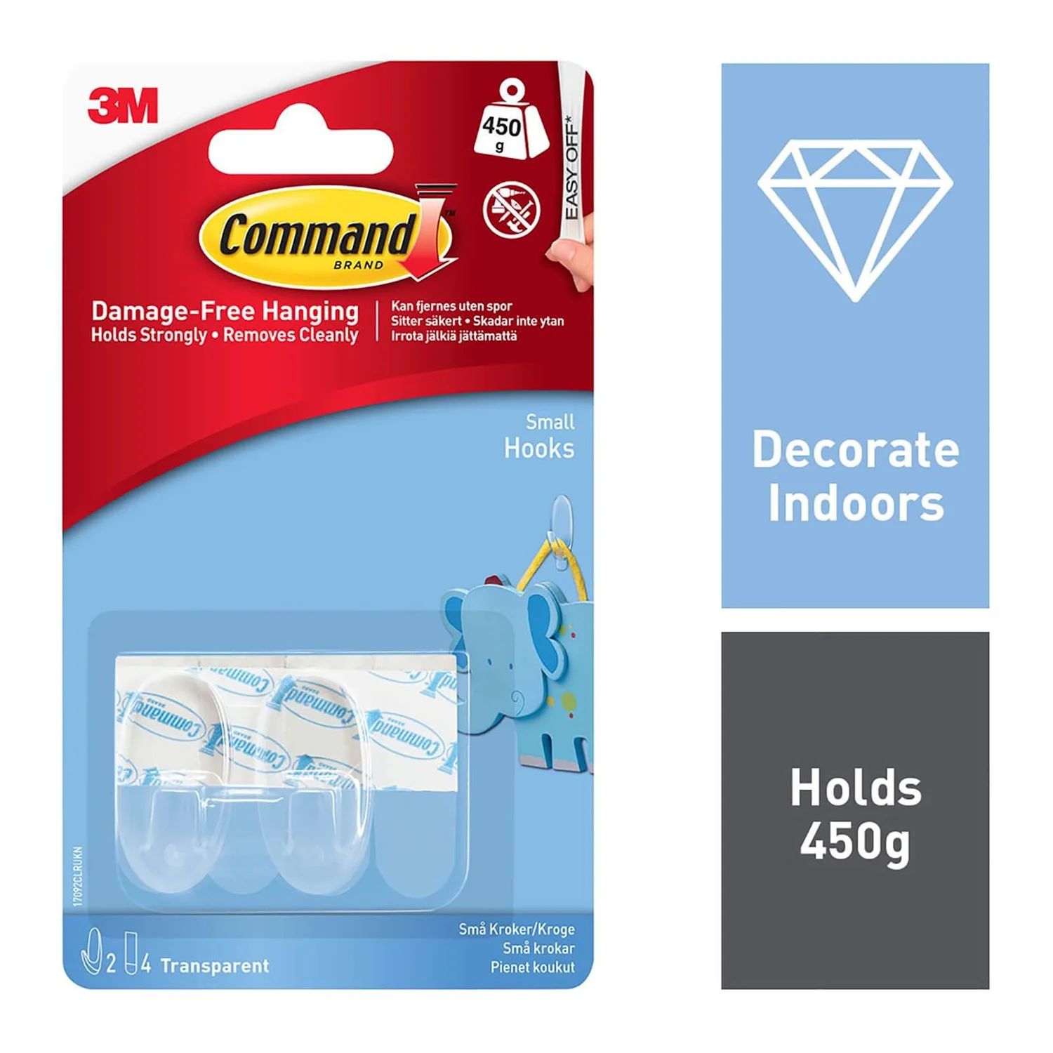 For effective damage free hanging indoors, use Command™ Small Clear Hooks with Clear Strips. They hold strongly to a variety of surfaces including solid, hollow and painted walls, as well as other materials including wood, tile, metal and glass. They’re easy to apply and remove, leaving no holes, marks or sticky residue. Our clear hooks and strips blend in seamlessly, making them suitable for any room in the house or office. Rehanging them is as easy as applying a Command™ Clear Refill Strip, so you can take down, move and reuse them again and again.