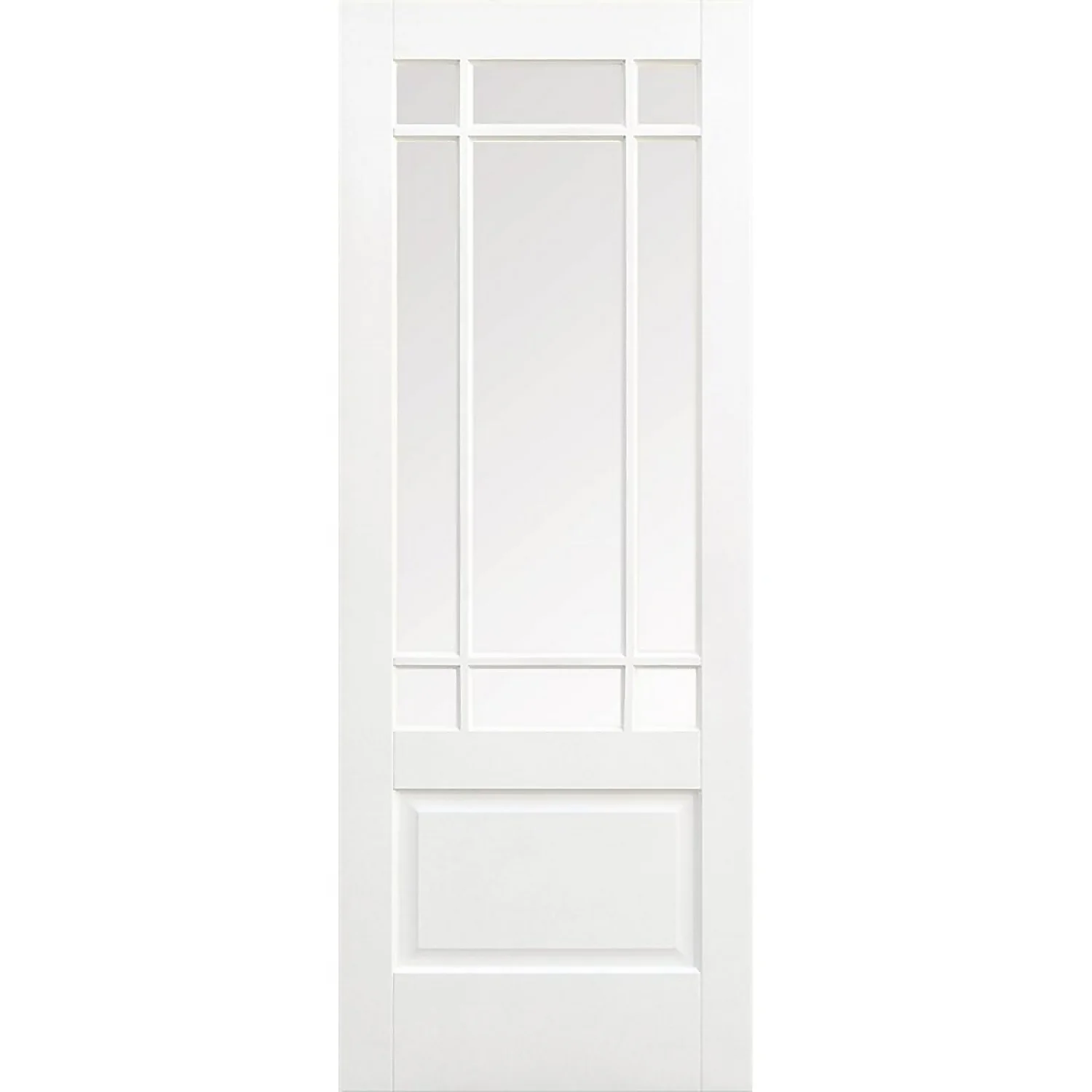 This white internal door in a versatile primed finish, blends style with practicality. Clear bevelled glazed panels with decorative bars create a bright and airy feel in a room. Perfect for all kinds of interior spaces, like a dining room, family room, study or kitchen. With a solid core construction for lasting quality.