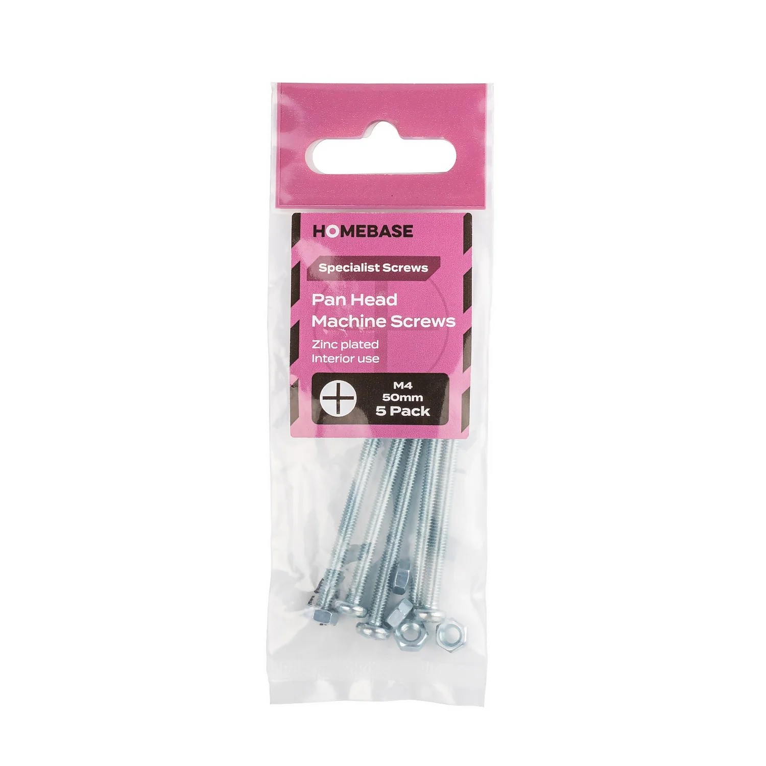 This 5 pack of Machine screws are 50mm in length and have a 4mm diameter. Used in metal to metal applications where holes are pre-drilled.