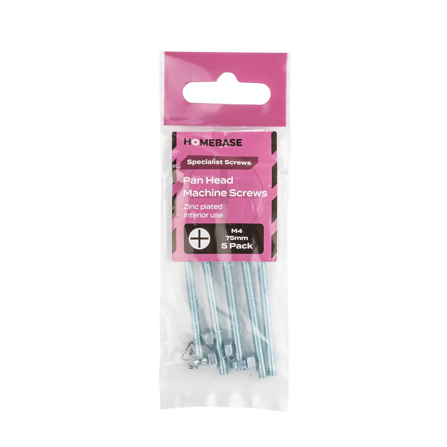 This 5 pack of Machine screws are 75mm in length and have a 4mm diameter. Used in metal to metal applications where holes are pre-drilled.