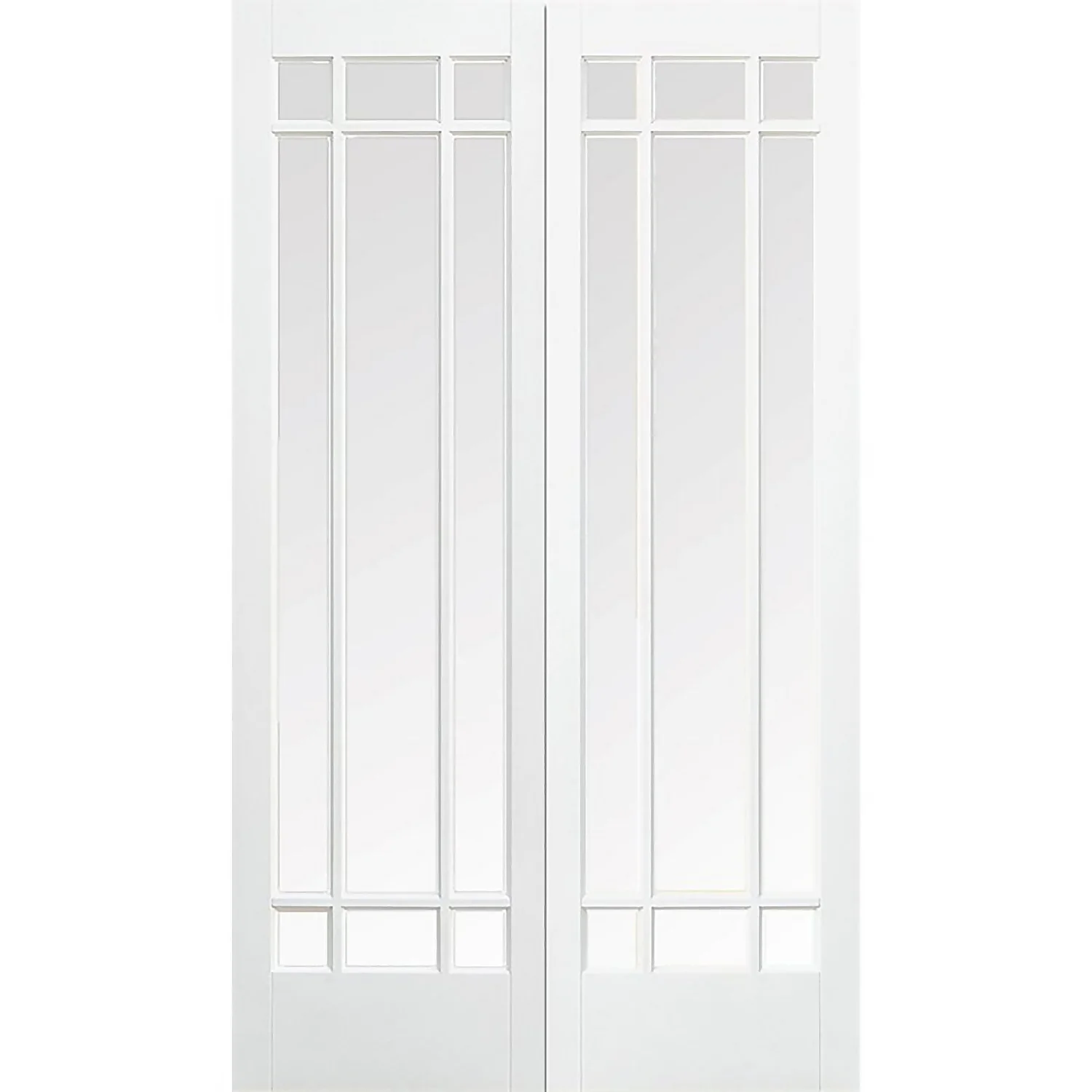 Pair two Manhattan doors together to create an attractive and functional entry point to your conservatory, lounge or dining room. Featuring clear bevelled glazing with decorative bars, it creates a striking look. This is a great option for open plan living spaces you are wanting to seperate whilst keeping the room feeling bright and airy. The primed white finish allows you to personalise this door to your own taste, creating a versatile product which will match all decor.