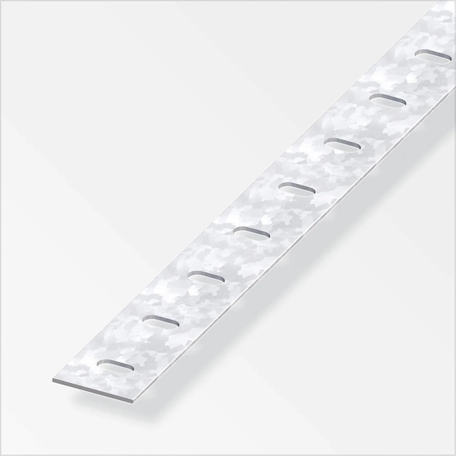 Flat bar profile with punched holes, made from galvanised steel.