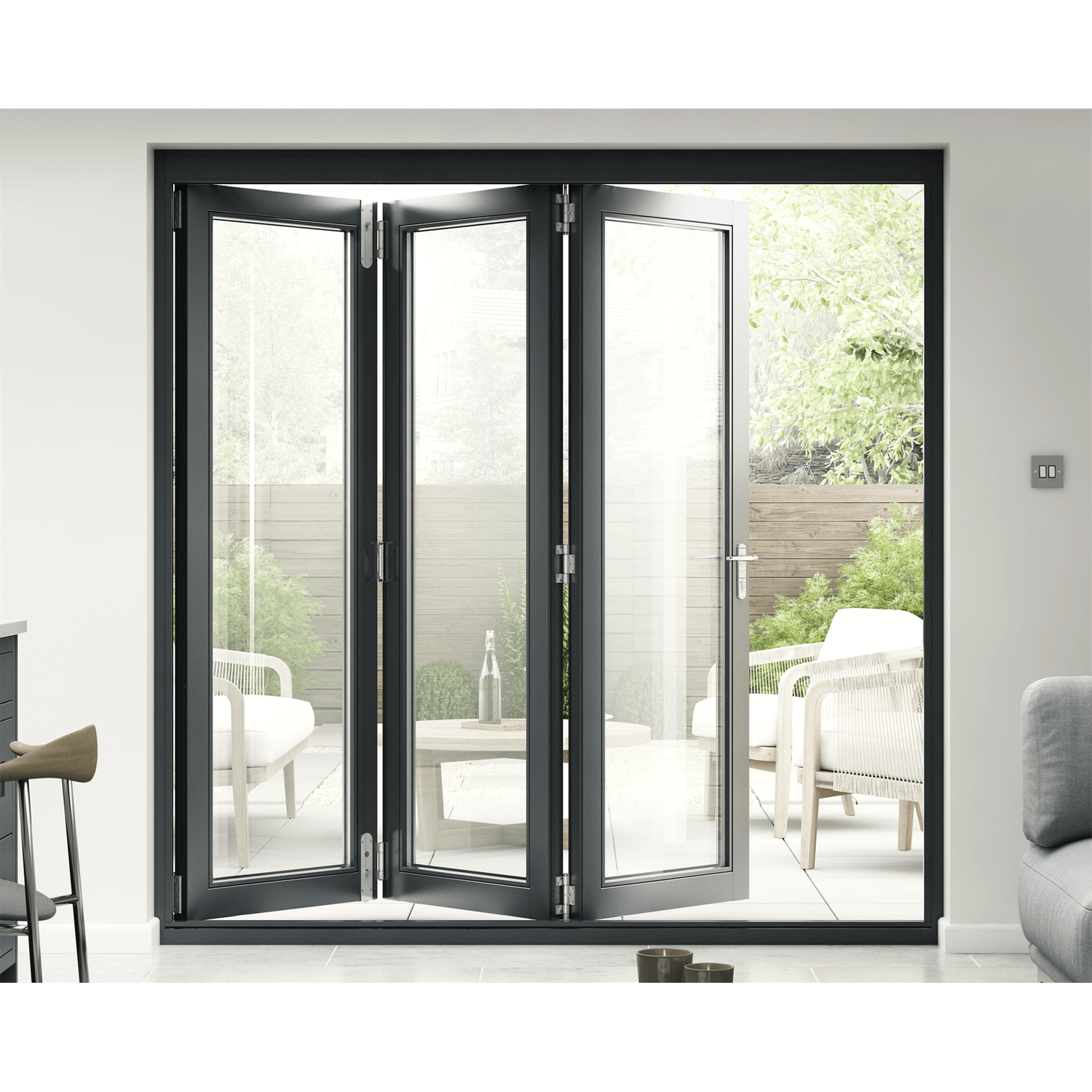 These external Bifold Doors, factory finished in Anthracite Grey (RAL7016M), feature a preservative-treated Engineered timber core, which is also treated with a water-repellent system for long-term stability and durability. The doors come factory-glazed with high performance LowE DG Units achieving a whole product U Value (thermal insulation) of 1.5 W/m2K.