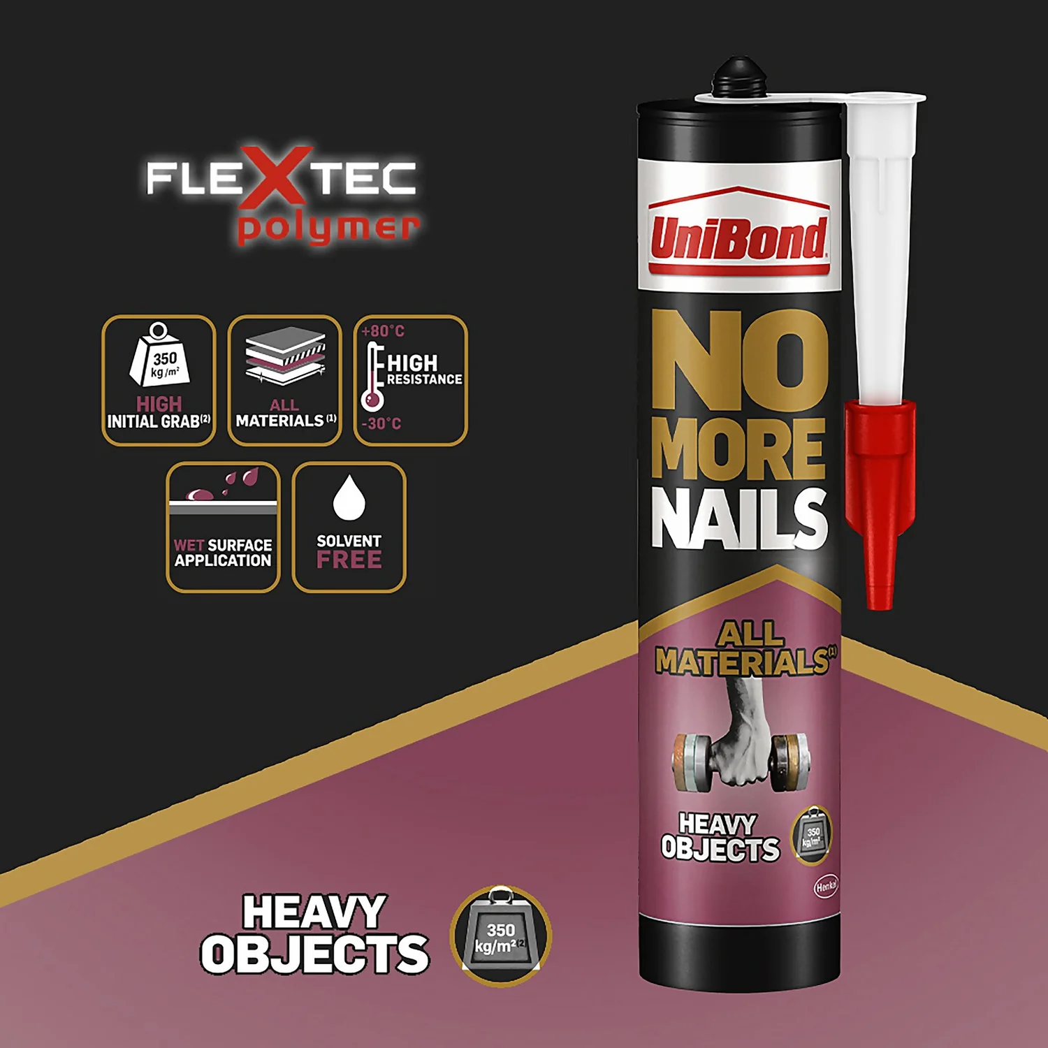 UniBond No More Nails All Materials Heavy Objects Grab Adhesive is a high quality solution for a range of household jobs. It provides the answer for DIY tasks, which require extra strength. It contains a flextec polymer, a Henkel technology that combines the flexibility to bond with outstanding adhesion and resistance to vibration under extreme temperatures. This durable adhesive has a high initial grab of up to 350 kg per m2. Its patented flextec polymer is water, UV and temperature resistant, which makes it suitable for most applications and materials. Including Mirror, ceramic, metal, concrete, brick, most plastics, stone, aluminium, polystyrene, glass and tile.