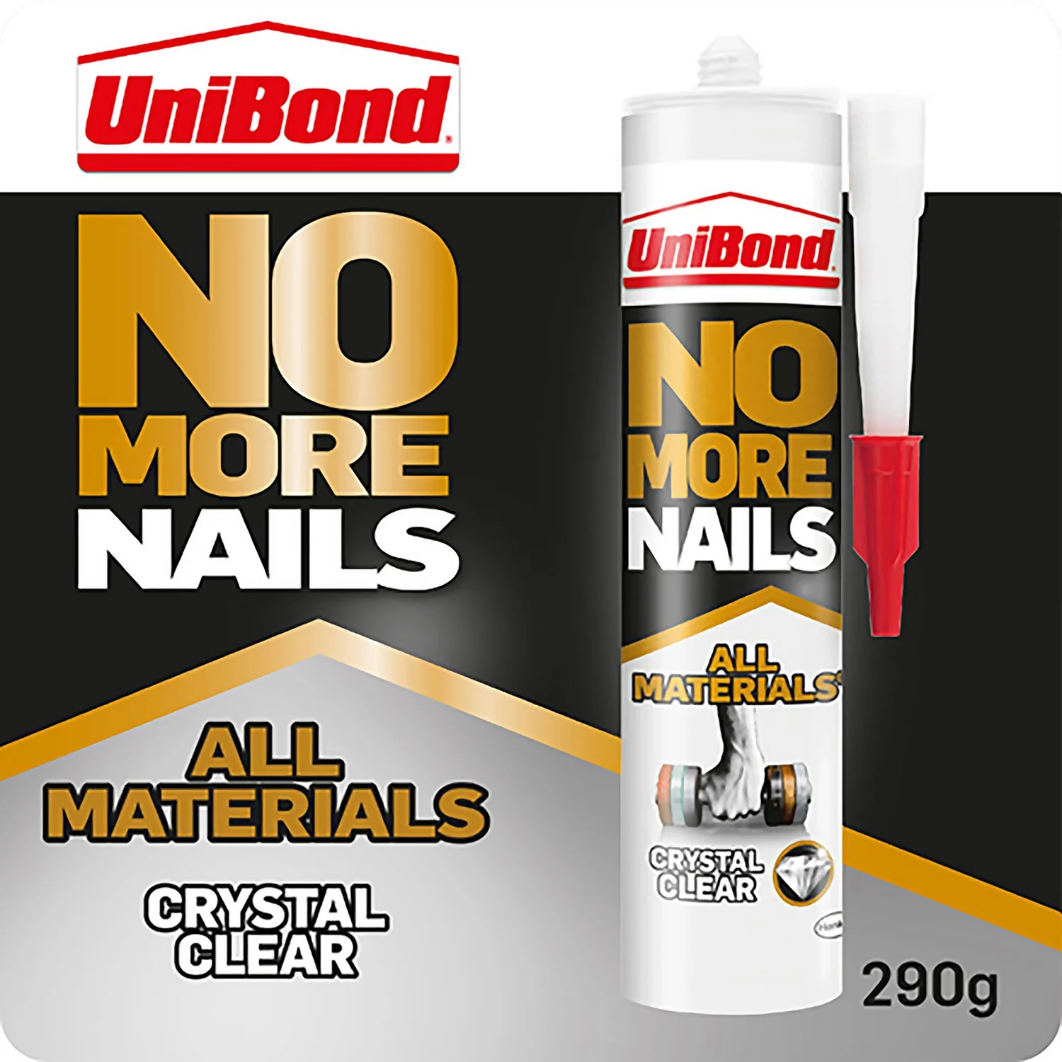 UniBond No More Nails All Materials Crystal Clear Grab Adhesive is a high quality bonding solution for most household jobs. A building and sealing adhesive, which is ideal for building and repairing on a range of materials and applications. It contains a flextec polymer, a Henkel technology that combines the flexibility to bond with outstanding adhesion and resistance to vibration under extreme temperatures. Its strong flexible adhesion makes it suitable for use under extreme conditions and on wet surfaces and still provides long lasting results. Solvent free and dries transparent for an aesthetic crystal clear finish.