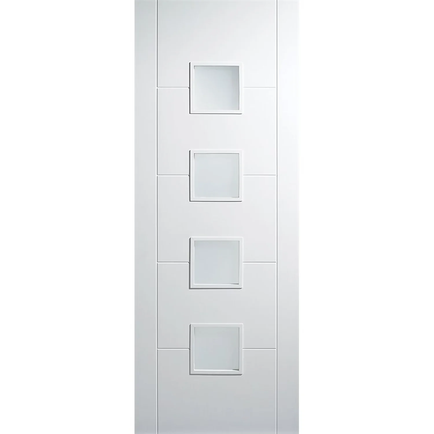 Cool and contemporary, this white internal door in a versatile primed finish, features four frosted glazed panels. These are set between grooved panels, and finished with raised moulding on either side, so you get a door with no shortage of attention to detail. Glazed to ensure light passes through, the frosting will also help maintain an element of privacy. So this door is ideal for rooms like studies, where you may want to let the light in but create a room free from distractions.